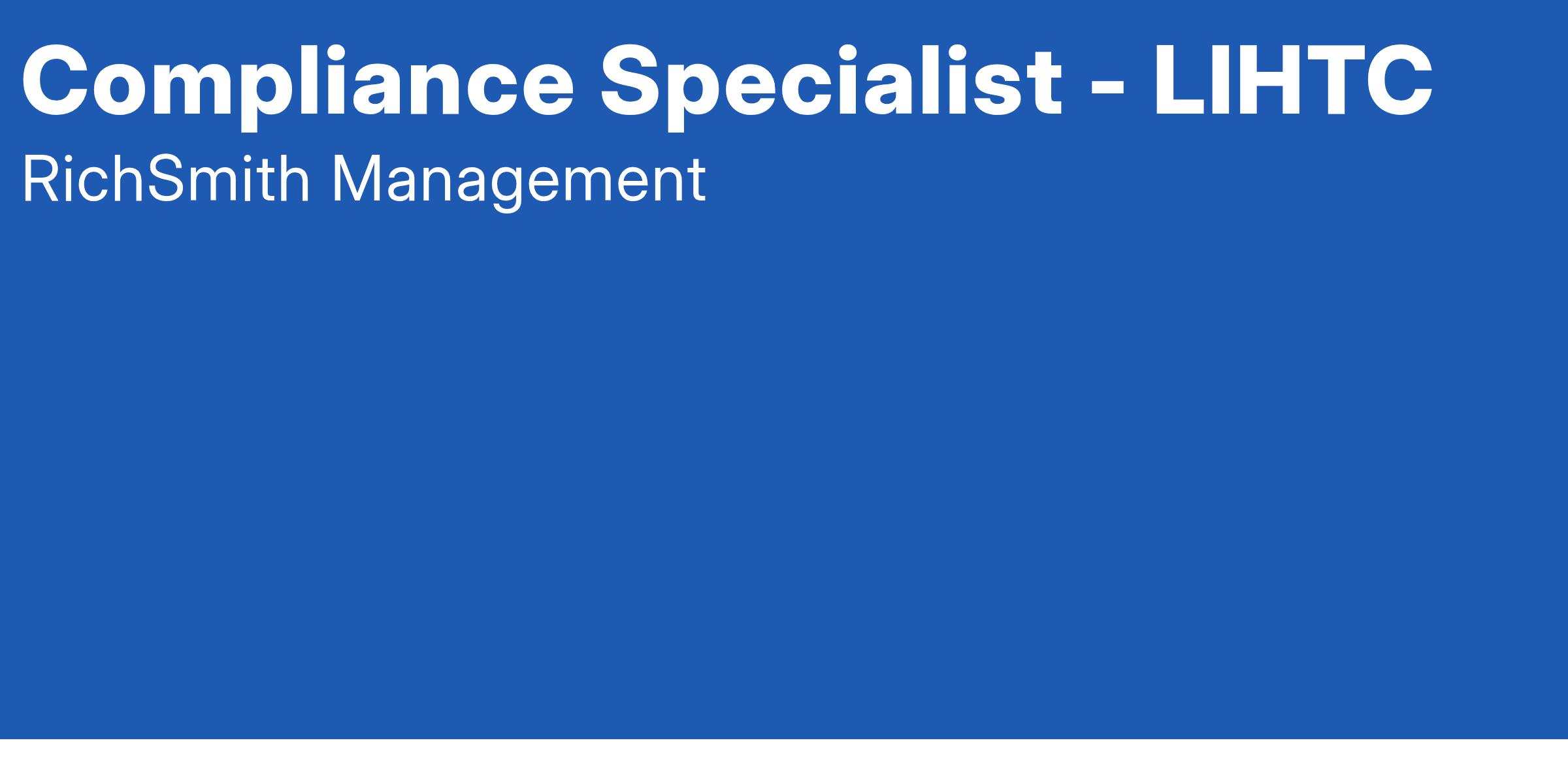 Are you a detail-oriented professional with expertise in compliance for LIHTC residential properties, and NSP programs? Richsmith Management is seeking a Compliance Specialist to join our growing property management company. This role involves performing file audits, advising communities on errors or missing documentation, and ensuring compliance with program guidelines.